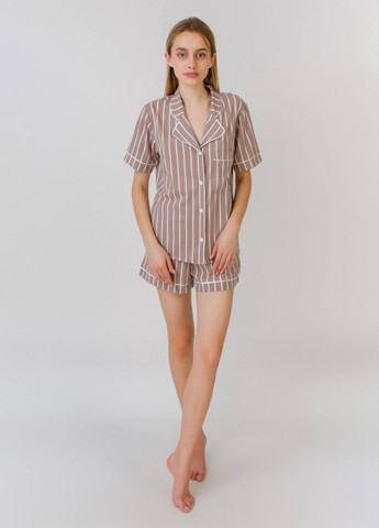 Комплект состоит из рубашки свободного кроя и шорт на эластичном поясе. Рубашка имеет классический отложной воротник, короткие рукава и удобную застежку на пуговицы. Небольшой накладной карман на груди подчеркивает стильность модели. Шорты с мягким поясом и шнурком обеспечивают комфортную посадку, а фигурный крой придает легкость и свободу движений.