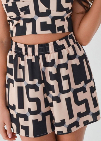 Футболка с круглым вырезом, шорты средней посадки с закругленными боками с небольшими разрезами, имеют боковые карманы и шнур в поясе для регулировки объема.