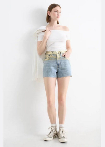 Хлопчатобумажные джинсовые шорты с высокой талией, застежкой на молнию и пуговицы. Открыты карманы спереди и сзади.
