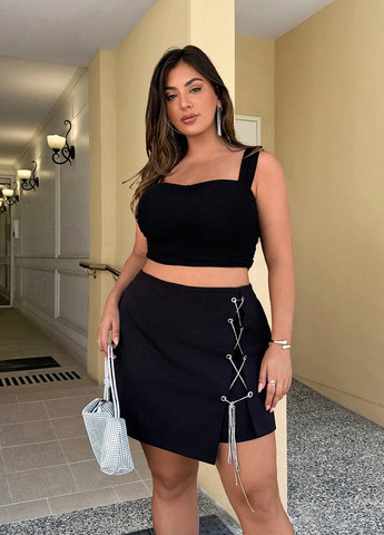 Женская юбка-шорты RueChic Plus, чёрная. Эта юбка-шорты подходит для повседневной носки. Высокая талия и короткая длина. Ткань: полиэстер с эластаном. Средняя эластичность. Рекомендации по уходу: машинная стирка.