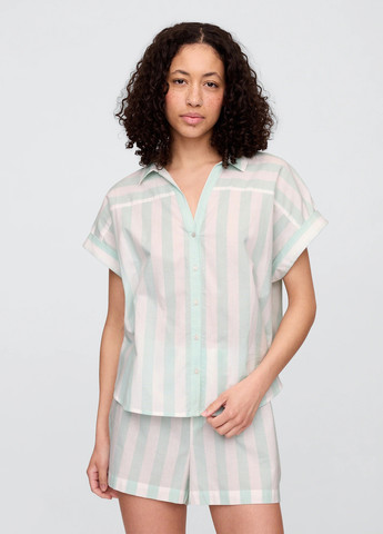 Женская пижама Gap. Красивый и удобный комплект для сна, который состоит из рубашки и шорт. Рубашка с отложным воротником и V-образным вырезом. Короткие рукава. Застегивается на пуговицы. Закругленный подол. Короткие шорты с эластичным поясом на резинке. Декоративные пуговицы и имитация гульфика. Пижама из легкой натуральной ткани с принтом в полоску. Отличное качество.