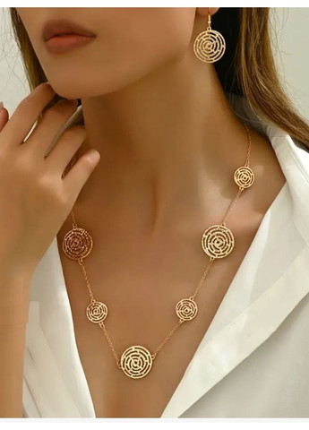 Ажурный комплект украшений - колье и серьги геометрия - стильная бижутерия для модной леди. Обхват колье - 60 см + удлинитель 5 см, диаметр кругов от 1,5 см до 2,5 см. Диаметр кругов в серьгах - 2,5 см, вес пары - 5 грамм. Вес всего комплекта - 20 грамм. Состав: ювелирный сплав, позолота (без штампа).