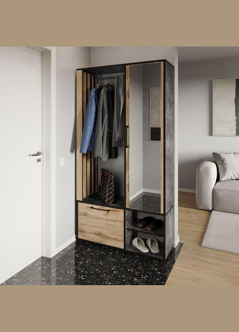 Размер: ● Высота 190 см ● Глубина 33 см ● Ширина 100 см Вес: 59 кг Цвета (+ Все возможные комбинации из двух цветов) : Антрацит, Аппалачи, Бетон, Белый, Венге темный, Сонома, Бетон темный, Бетон тефра, Дуб Гранж Песочный, Дуб Кверкус, Зеленый Дымчатый, Кашемир Производитель: Moreli/Украина Опис: Современная и удобная передняя KO-0003 от Moreli — это компактное решение для организованной прихожей. Модель оборудована штангой для вешалок, функциональными открытыми полками, дверцей на петлях с дотягивателем и зеркалом в полный рост. Снизу – место для обуви, а сверху – закрытый отсек для хранения. Конструкция выполнена из ламинированного ДСП, штанга изготовлена из металла, а ножки – из пластика с возможностью регулировки высоты для выравнивания на любой поверхности.