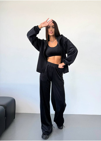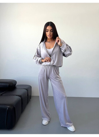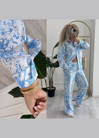 Верхняя часть комплекта имеет удлиненный фасон, спущенную линию плеча, застегивается на пуговицы и дополнена романтическими рюшами по низу. Брюки с высокой посадкой, свободного кроя, на эластичном поясе, что обеспечивает комфорт в течение дня.