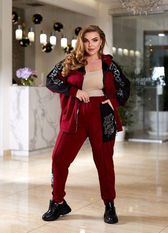 В этот комплект входит толстовка с капюшоном и спортивные штаны. Дизайн украшен графическими буквами из стразов и вышивкой. Ткань средней эластичности и застегивается на шнурок.