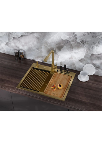Стоит только поверить, что вы можете – и вы уже на полпути к цели. (Теодор Рузвельт) Элегантная кухонная раковина золотого оттенка превратится в изысканный упор интерьера вашей кухни, радуя глаза на протяжении многих лет. Атрибуты золотой мойки для кухни Преимущество накладной мойки Раковина золотистого цвета изготовлена из высококачественной нержавеющей стали AISI 304, обеспечивая надежность и длительный срок службы. Стальная прочность Толщина стали равна 1 мм обеспечивает не только оптимальный вес, но и отличное сопротивление механическим воздействиям. Ручное изготовление Раковина ручной работы отличается превосходным качеством, функциональностью и стойкостью к повреждениям. Процесс изготовления включает формовку, сварку и шлифовку, а затем обработку специализированным антишумовым материалом. Золотая эстетика с покрытием PVD (Nano) Рассмотрите возможность выбора врезной мойки с золотым Nano-покрытием, которое продолжит защищать металл даже при случайных повреждениях. Тишина и комфорт Полное шумоподавление и защита от конденсации обеспечивают тихую и комфортную эксплуатацию. Бонус: получите бесплатный сифон! При покупке мойки у нас вы также получите сифон из нержавеющей стали 304 марки, что позволяет сэкономить на дополнительных расходах. Эксклюзивное предложение на украинском рынке! Мы предлагаем мойку нового типа с встроенным отверстием для ножей. Теперь вам не нужно тратиться на дополнительные подставки и занимать ценное пространство на вашей кухне. Избавьтесь от лишних элементов и мест накопления грязи, выбрав нашу инновационную мойку!