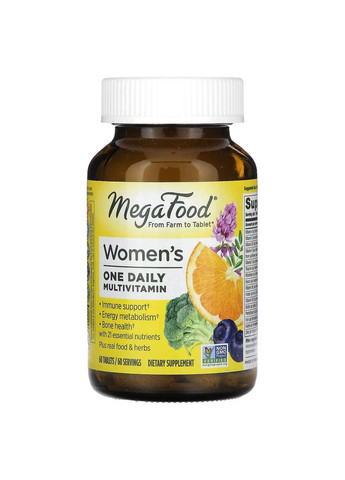 Свойства продукта: Поддерживает высокий уровень энергии и жизненного тонуса Способствует повышению концентрации внимания Поддерживает иммунную систему Поддерживает нормальную работу нервной системы Помогает укреплению костной ткани Показания к применению Принимать по 1 таблетке в день. Можно принимать в любое время дня, даже натощак. Что это? Витаминно-минеральный комплекс Women One Daily содержит витамины А, C, D, В-комплекс, а также микроэлементы, которые необходимы женскому организму для поддержания нормальной жизнедеятельности. Питательная смесь продуктов и трав поддерживает пищеварение и здоровье нервной системы. Мультивитамины можно принимать в любое время дня, даже натощак. Как это работает? Этот продукт MegaFood изготавливается на основе продуктов питания от проверенных партнеров – семейных ферм. MegaFood использует свой уникальный процесс сочетания витаминов и минералов со смесью из цельных пищевых продуктов, чтобы обеспечить гарантированную эффективность и полезные свойства соединений, присутствующих в самой пище. Отдельное направление комплекса – здоровая поддержка организма при изменениях, связанных с ежемесячными колебаниями гормонов. 9 мг железа восполняет потери этого микроэлемента во время менструаций. В-комплекс способствует здоровью нервной системы. Витамин D в сочетании с кальцием поддерживает здоровье костей. Элемент Вес Единица Процент Порция 1 таблетка Порций в упаковке 60 Витамин А (в виде бета-каротина) 370 мкг РАЭ 41,00% Витамин С (в виде аскорбиновой кислоты) 60 мг 67,00% Витамин D3 (в виде ферментированного холекальциферола) 10 мкг 50,00% Витамин Е (в виде d-альфа-токоферола из подсолнечного масла) 10 мг 67,00% Витамин К (в форме фитонадиона) 75 мкг 63,00% Тиамин (в виде гидрохлорида тиамина) 1,5 мг 125,00% Рибофлавин (как рибофлавин) 1,7 мг 131,00% Ниацин (как ниацинамид) 20 мг НЭ 125,00% Витамин B6 (в виде гидрохлорида пиридоксина) 4 мг 235,00% Фолат (в виде фолиевой кислоты) 400 (240) мкг ДФЭ (мкг фолиевой кислоты) 100,00% Витамин B12 (в виде цианокобаламина) 10 мкг 417,00% Биотин (как биотин) 30 мкг 100,00% Пантотеновая кислота (в виде пантотената d-кальция) 10 мг 200,00% Железо (в виде ферментированного бисглицината железа) 9 мг 50,00% Йод (в виде ферментированного глицината йода) 100 мкг 67,00% Цинк (в виде ферментированного бисглицината цинка) 9 мг 82,00% Селен (в виде ферментированного глицината селена) 18 мкг 33,00% Медь (в виде ферментированного бисглицината меди) 0,04 мг 4,00% Марганец (в виде ферментированного бисглицината марганца) 2 мг 87,00% GTF Chromium (в виде ферментированного глицината хрома, никотината, глутамата) 40 мкг 114,00% Молибден (в виде ферментированного бисглицината молибдена) 37 мкг 82,00% Бор (в виде ферментированного глицината бора) 500 мкг ** °Смесь пищевых продуктов и трав Органический коричневый рис, органический апельсин, морковь, органические плоды целомудренного дерева, органический корень астрагала, органический корень элеутерококка, органическая клюква, органический корень ашваганды, органический корень имбиря, органический лист крапивы, органический лимонник лимонник, фрукты, органическая головка брокколи. , органическая черника, кочан капусты, органический корень одуванчика, органический лист красной малины, органический лист розмарина, органический лист хвоща, органический гриб шиитаке. 259 мг ** **% Дневная норма (ДВ) не установлена.