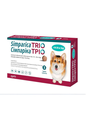 Simparica TRIO – противопаразитарный препарат широкого спектра действия, корорый можно использовать для лечения животных возрастом от 8 недель, которые имеют вес от 20 до 40 кг. Препарат следует применять только у собак, когда одновременно показано лечение клещей/блох и желудочно-кишечных нематод. При отсутствии риска смешанной ко-инфекции следует применять препарат более узкого спектра действия Его особенность состоит в том, что всего одна жевательная таблетка, имеющая приятный для собаки вкус и не вызывающая трудностей при введении, может защитить вашего питомца от основных видов самых опасных паразитов. Симпарика ТРИО защищает собаку от сердечных червей, клещей и блох, аскариды и анкилостомы. К счастью, дирофиляриозом (сердечный червь) в нашем климате собаки болеют не часто, но полностью исключить такую вероятность нельзя. Это очень опасное, трудно диагностируемое заболевание, и лучшее его лечение – профилактика. О вреде клещей для животных и человека известно всем, остаётся только подытожить, что клещи могут заразить животное минимум 15 различными опасными заболеваниями, включая болезнь Лайма. Препарат Simparica Trio эффективен для борьбы с 5 видами клещей в течении 28 дней после приёма. На блох Симпарика Трио действует в течение 35 дней после введения. Действие начинается очень быстро, уже через 4 часа взрослые блохи начинают гибнуть, не успев отложить яйца. Ещё одним опасным не только для собак, а и для людей, является заражение аскаридами. Simparica Trio эффективно борется со взрослыми и незрелыми паразитами (Toxascaris leonina, Toxocara canis), обеспечивая здоровье животному и людям. Постоянное использование препарата для профилактики и лечения разных паразитов обеспечит здоровье и цветущий вид вашему питомцу, и вы будете подвергаться меньшей опасности заразиться. Преимущества и особенности: таблетки с тремя активными ингредиентами для защиты от блох и клещей, ангиостронгиллеза, дирофиляриоза и желудочно-кишечных нематод. ; возможно применять щенкам с 8 недель; приятный для собак вкус гарантирует простоту введения; широкий ассортимент по дозировке и размеру таблеток гарантирует максимальный комфорт применения и эффективность Simparica Trio; быстродействие после введения обеспечивает быстрое избавление от большинства паразитов. Simparica Trio – это вкусные жевательные таблетки со вкусом печени для собак от блох, гельминтов и клещей. Фармакологические свойства: Активен против взрослых блох (Ctenocephalides canis, С.felis), некоторых видов клещей (Dermacentor reticulatus, Ixodes hexagonus, I. ricinus, Rhipicephalus sanguineus и Sarcoptes scabiei). Лабораторные исследования показали активность против таких видов клещей, как Dermacentor variabilis, Ixodes scapularis, Amblyomma americanum, A. maculatum, а также клеща Demodex canis и Otodectes cynotis. а также лечение и контроль круглого червя ) и взрослый инфекции анкилостомы (Ancylostoma caninum и Uncinaria stenocephala) в течение одного месяца у собак и щенков После применения препарата проявляет активность против блох через 8 ч, а против клещей (Ixodes ricinus) действие препарата начинается через 12 ч и продолжается в течение 35 сут после применения. Препарат действует на все виды блох, паразитирующих на собаках, вызывает их гибель до момента отложения яиц, предотвращает загрязнение яйцами белых мест обитания животных, пораженных блохами. Дозы и способ применения: Препарат применяют собакам однократно перорально с кормом или без корма. Живот