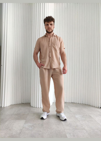 Мужской летний костюм Ткань: лен жатка Брюки прямого кроя на резинке Длина 110 см Рубашка прямая на пуговицах. Длина 72 см 🌸 цвета: черный, белый, серый, беж Рост модели на фото 186 см