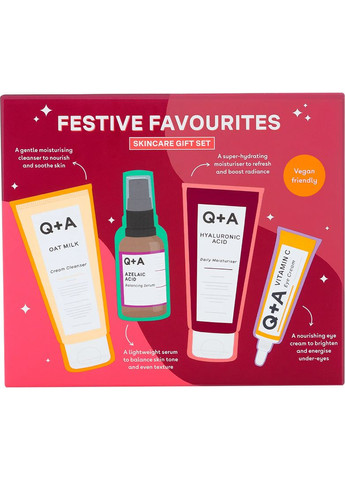 Подарочный набор по уходу за кожей лица Q+A Festive Favourites Gift Set 1. Очищающий крем для лица с овсяным молоком Q+A Oat Milk Cream Cleanser, 125мл – это мягкое увлажняющее средство, содержащее тройную смесь ингредиентов, полученных из овса, которые мягко удаляют макияж и загрязнение, оставляя свежий и свежий. Обеспечит мягкую ежедневную очистку покрова, не нарушая его природный баланс. После использования этого уходового продукта ваша кожа приобретет невероятное ощущение свежести, чистоты и комфорта. 2. Сыворотка для лица с азелаиновой кислотой Q+A Azelaic Acid Balancing Serum, 30мл – не только мгновенно успокоит кожу, но и существенно сократит воспаление, предотвратив возникновение новых. Также этот уход за продуктом прекрасно восстанавливает здоровый тон лица, очищает поры и в целом хорошо работает как с сухой, так и жирной или проблемой дермой. За счет того, что в составе сыворотки имеется азелаиновая кислота, она заметно освещает тон и все пигментные пятна. 3. Увлажняющий крем для лица с гиалуроновой кислотой Q+A Hyaluronic Acid Daily Moisturiser, 75мл - стимулирует синтез коллагена и эластина, подтягивает кожу, усиливает ее естественный блеск, гладкость и стойкость, предотвращает старение. Регулирует микросекрецию клеток, уменьшая количество свободных радикалов и тем самым предотвращая старение кожного покрова. Разглаживает морщины и препятствует их повторному образованию, подходит всем типам кожного покрова. 4. Питательный крем для кожи вокруг глаз с витамином C Q+A Vitamin C Eye Cream, 15мл – питательный крем осветляет и заряжает энергией кожу вокруг глаз. Смесь витамина С, экстракта вишни и гиалуроновой кислоты гармонично работает, чтобы оживить нежную кожу, обеспечивая необходимое количество влаги и антиоксидантов. Крем оказывает антивозрастное действие, успокаивает, делает кожу упругой, разглаживает морщинки, осветляет пигментацию.