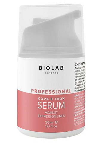 Сыворотка против мимических морщин Cova B Trox Serum от бренда BioLab Estetic - это инновационное средство с пептидом Cova B Trox, разработанное для разглаживания морщин и восстановления упругости кожи. Благодаря экстракту ламинарии сыворотка расслабляет мимические мышцы, ускоряет обменные процессы и способствует интенсивному увлажнению. Особенности Cova В Trox Serum BioLab Estetic: - уменьшает выраженность мимических морщин, делая кожу гладкой и упругой с виду; - формирует защитную пленку, содержащую влагу и полезные микроэлементы внутри клеток; - ускоряет метаболизм в клетках, способствует омоложению кожи, насыщает ее витаминами, аминокислотами и антиоксидантами; - сыворотка против мимических морщин оказывает пролонгированное увлажняющее и защитное действие.