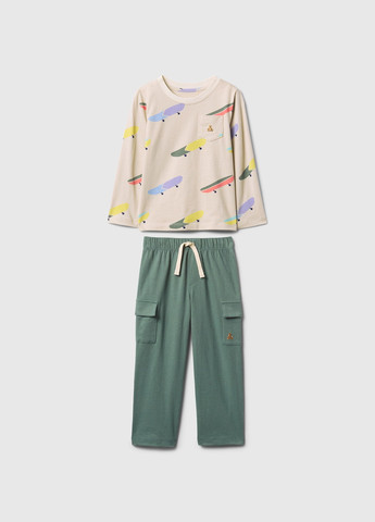 Детский костюм GAP. Удобный и стильный костюм от GAP для малышей — идеальный выбор для активных прогулок и повседневной носки. Комплект состоит из лонгслива и штанов. Лонгслив из мягкого хлопка с круглым вырезом и длинными рукавами. Горловина  в рубчик. Декорирован принтом со скейтбордом. Нагрудный карман с вышитым мишкой. Спортивные штаны прямого кроя с эластичным поясом на завязках и двумя боковыми карманами. Удобны для активных движений и легко сочетаются с другими вещами гардероба. Отличное качество.