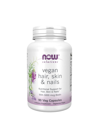 Vegan Hair, Skin amp; Nails — это высококачественная диетическая добавка, созданная для поддержания здоровья и красоты ваших волос, кожи и ногтей. Содержит 5000 мкг биотина, этот продукт от NOWreg; Solutions работает на клеточном уровне, обеспечивая комплексный подход к уходу за внешностью изнутри. Формула Vegan Hair, Skin amp; Nails включает в себя аминокислоты и микроэлементы, необходимые для выработки коллагена и кератина, которые являются основными строительными блоками волос, кожи и ногтей. Антиоксидантные витамины C и E защищают кожу от вредного воздействия свободных радикалов, а гиалуроновая кислота поддерживает уровень увлажненности и молодости кожи. Преимущества: Вегетарианский и веганский состав: Продукт не содержит ингредиентов животного происхождения, что делает его идеальным выбором для веганов и вегетарианцев. Поддержка коллагена и кератина: Способствует улучшению структуры волос и кожи, делая их более здоровыми и привлекательными. Антиоксидантная защита: Витамины C и E помогают защищать клетки кожи от окислительного стресса, замедляя процесс старения. Увлажнение и здоровье кожи: Гиалуроновая кислота обеспечивает глубокое увлажнение, делая кожу более упругой и эластичной. Эта добавка предназначена для всех, кто стремится улучшить свое общее состояние волос, кожи и ногтей. Она будет особенно полезна для людей с повышенными требованиями к своему внешнему виду, а также для тех, кто сталкивается с проблемами, связанными с состоянием кожи или волос. Рекомендуется принимать по две капсулы в день во время еды, что обеспечивает оптимальное усвоение всех полезных компонентов. Vegan Hair, Skin amp; Nails — это ваш надежный помощник на пути к естественной красоте и здоровью!