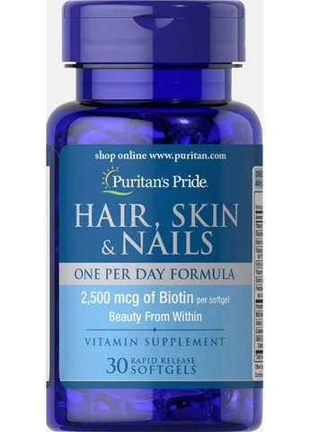 Формула для волос, кожи, ногтей (Hair, Skin & Nails) - эта витаминная добавка содержит много различных полезных витаминов, включая биотин, витамин А, фолиевую кислоту и МСМ, которые обеспечивают красоту изнутри. Производитель: Puritan's Pride, США Форма выпуска: 30/60 капсул Возраст: 18+ Состав: Компонент Состав 1 капсулы Витамин А (как ретинил пальмитат) 5000 МЕ Рибофлавин (Витамин В-2) 2 мг Ниацин (в виде ниацинамида) 2 мг Витамин В6 (как пиридоксин гидрохлорид) 2 мг Фолиевая кислота 200 мкг Витамин В12 2 мкг Биотин 2500 мкг Пантотеновая кислота 40 мг Экстракт хвоща полегого 29 мг Экстракт виноградной косточки 25 мг MSM (метилсульфонилметан) 200 мг Альфа-липоевая кислота 25 мг DMAE битартрат (диметиламиноэтанол битартрат) 50 мг Другие ингредиенты: соевое масло, желатин, растительный глицерин, натуральный цвет карамели, силикагель, соевый лецитин. Не содержит: искусственных добавок, консервантов, сахара, молока, лактозы, сои, клейковины, пшеницы, дрожжей, молюсков, соли. Функциональное действие: Формула для волос, кожи, ногтей (Hair, Skin & Nails) - уникальная, для ежедневного приема, формула, которая обеспечивает красоту и здоровье волос, ногтей, кожи. Hair, Skin & Nails Formula содержит необходимые витамины: биотин, витамин А, фолиевая кислот и экстракты трав для обеспечения здоровья изнутри. Поступление в организм достаточного количества витаминов и здоровье кожи, волос, ногтей очень тесно связаны между собой и играют важную роль для продления молодости и красоты. Витамин А и витамин Е мощные антиоксиданты, необходимы для людей, которые страдают от акне, они способствуют быстрому заживлению ран, обладают отличным омолаживающим эффектом. Витамины Е и С являются эффективными антиоксидантами, которые помогают бороться со свободными радикалами в организме, помогают в борьбе с признаками старения кожи. Витамин С участвует в синтезе коллагена, улучшает микроциркуляцию в верхних слоях кожи и питает кожу головы. Витамины группы В также очень полезны для кожи, ногтей и волос. Биотин, входящий в состав комплекса, регулирует обмен веществ (жировой и углеводный), участвует в синтезе коллагена, защищает волосы от седины, а кожу от преждевременного старения. Он способствует поступлению и доставки серы к ногтям, волосам и коже. При употреблении Hair, Skin & Nails Formula кожа станет ровной и увлажненной, волосы станут мягкими и блистящими, ногти станут крепче и не будут слоиться, расти быстрее. Применение: Принимать по 1 капсуле в день, желательно во время еды или по указанию врача. Противопоказания: Индивидуальная непереносимость компонентов. Предупреждение: При беременности, кормлении грудью, приеме каких-либо медицинских препаратов или наличии каких-либо заболеваний следует проконсультироваться с врачом перед употреблением любых пищевых добавок. В случае возникновения каких-либо побочных реакций прекратите использование и проконсультируйтесь с врачом. Хранить в недоступном для детей месте. Не использовать, если внешняя защитная мембрана отсутствует или повреждена. *** Производитель оставляет за собой право изменить внешний вид упаковки. Мы стараемся следить за изменениями, но, если вы заметили какое-либо несоответствие, пожалуйста, сообщите нам об этом в письме или в комментарии к товару. Спасибо! **** БАД не является лекарством!