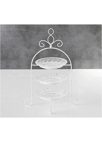 Очень удобная, функциональная этажерка. Состоит из трех ярусов прозрачных тарелочек. Металлическая основа белого цвета на ножках. Сверху приукрашена двумя маленькими птицами. Эта этажерка станет настоящим украшением вашего стола. На ней можно подать пирожные, фрукты, ягоды, конфеты, выпечку. Также можно использовать в декоративных целях, как подставку для искусственных цветов. Прекрасно подойдет для кухни, столовой, прихожей.
