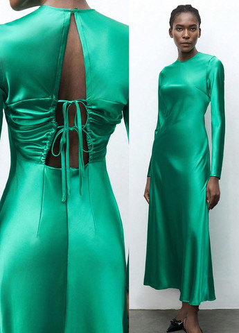 Изумрудное платье с сатиновым блеском, высокой горловиной и акцентом на спине – элегантный образ с современным характером. Приталенный силуэт и драпировка с завязками создают скульптурный эффект, а глянцевая фактура придает роскоши.