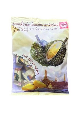 Дуриан знает каждый, кто никогда не был в Таиланде. Кожура этого фрукта имеет очень неприятный запах и достаточно стойкая. При снятии кожуры велик риск быть носителем «ладана» длительное время. Это одна из причин, по которой дуриан проносить в отели категорически запрещено, а у туристов нет такого желания. МИТМАИ сжалился над любителями экзотики! Нежное жевание сока дуриана — это простой способ насладиться захватывающим вкусом фруктов, таких как папайя, ананас, банан, манго и ваниль, без жертв и горечи. В этом продукте относительно меньше сахара, чем в других сладостях, он не вредит зубам и фигуре и приносит пользу при разумном употреблении. Ингредиенты Натуральный сок дуриана – источник витаминов и минералов! Каждая конфета в отдельной упаковке. Относитесь с доверием к своим друзьям, близким и коллегам, создавайте хорошее настроение и делитесь новыми впечатлениями. Пачка жевательных конфет МИТМАИ превращает любое чаепитие в маленький праздник! Хотите ощутить экзотический колорит Тайланда за чашечкой чая? Тогда эти конфеты из дуриана для вас! Ингредиенты и пищевая ценность Прежде чем купить азиатские десерты, следует знать, что в их состав входят только натуральные ингредиенты – виноградный сироп. солод для придания структуры сахару; сахарная пудра; Нарезанные кусочки сочного кокоса; Экзотический дуриан. Почему его выбрали? Производители кондитерских изделий добавляют в свою продукцию только тайские ингредиенты, а дуриан или «король фруктов» является одним из символов этой азиатской страны. Мало кто отважится его попробовать из-за резкого неприятного запаха, но те, кому достучалось до теста, поймут, почему оно получило такое прозвище. Вот почему конфеты из дуриана так популярны. Вы даже не сможете почувствовать его одновременно с нежным вкусом тропиков. «Король фруктов» содержит ноты банана, папайи, ванили, ананаса и манго. Аналогов сладости этого плода кокоса на современном рынке кондитерских изделий нет. Все путеводители по Таиланду рекомендуют покупать эту нежную конфету. Сам дуриановый сахар мягкий, но молочно-белого цвета не липнет к зубам, что гарантирует отсутствие красителей в составе. В состав десерта входят сахар, виноградный сироп, вода, каррагинан, соль, пищевой краситель, ароматизатор для дуриана. Вкус ненавязчивый, сливочный и приятно фруктовый. Помимо обычной упаковки, каждая конфета упакована в целлофан.