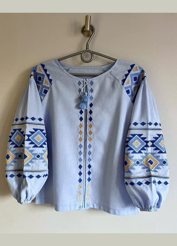 Светло- синий оттенок символизирует чистоту, легкость и безграничные возможности, а вышивка в сине-золотых тонах делает эту модель особенной. Материал: ✔ натуральный лен – легкий, дышащий и гипоаллергенный. ✔ Приятен к телу, не парит и не вызывает раздражений. ✔ Отличная воздухопроницаемость – комфорт даже в жаркую погоду. Дизайн и орнамент: ✨ Рукава украшены традиционными украинскими узорами в виде ромбов и геометрических элементов, которые символизируют защиту и силу. ✨ Центральная вышивка с вытянутыми ромбами подчеркивает элегантность силуэта. ✨ Украшение кисточками на завязках добавляет аутентичности образу. Комфорт и удобство: 💙 Свободный крой обеспечивает полную свободу движений. 💙 Длинные рукава на резинке – защита от прохлады и удобство в носке. 💙 Универсальность – подходит как для праздничных мероприятий, так и для повседневной носки. Как сочетать? 🔹 Идеально смотрится с джинсами, брюками, юбками или шортами. 🔹 Можно носить с поясом или без – создавая разные образы. 🔹 Отличный вариант для фотосессий, школьных мероприятий, семейных торжеств. 💙 Вышиванка – это не просто одежда, а частичка украинской души в гардеробе вашей девочки!