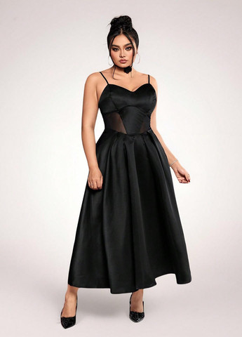 Это платье сочетает в себе лиф-бюстье со струящейся юбкой А-силуэта, имеет открытую спину и бретельки-спагетти. Платье включает в себя контрастную сетчатую отделку и высокую талию. Ткань не тянется. Подол расклешенный.