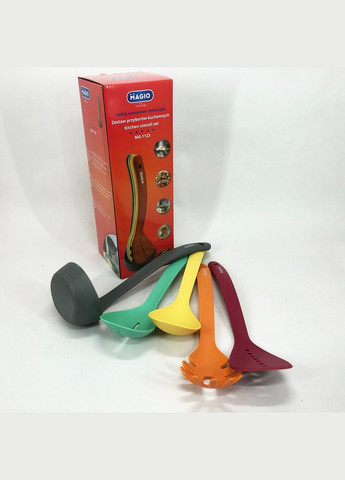 Количество предметов: 5 шт Шумовка – 32,5 х 11,2 см Ложка для спагетти – 33 х 6,3 см Ложка для салата – 29,5 х 7 см Половник – 30,5 х 9 см Лопатка – 31,5 х сил 9,5 см Материал – пластик