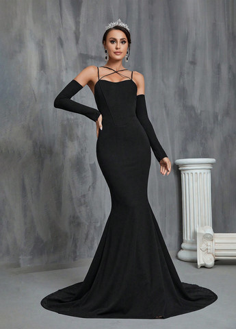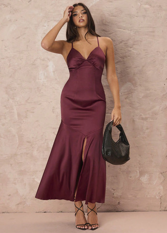 Элегантное платье-слинг Fishtail. Это платье с высокой талией и разрезом по низу. Имеет открытую спину и бретельки-спагетти. Ткань средней эластичности.