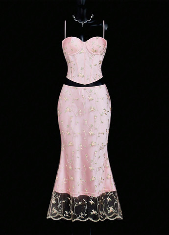 Мини-платье имеет обжатый силуэт с эффектом push-up, визуально подтягивая и формируя фигуру, а драпировка по бокам создает трендовый рельеф и дополнительно моделирует талию и бедра. Длинные рукава платья имеют вырезы для пальцев, что является современным акцентом. Макси-юбка из стрейч-сетки на резинке выступает как трансформер, создавая эффект полупрозрачного шлейфа. Этот комплект позволит вам быть главной звездой вечера, играя с фасонами и степенью открытости образа, его можно носить как мини-платье, сочетать с макси-юбкой сверху или снизу, или комбинировать юбку с другим верхом, таким как корсет или топ.