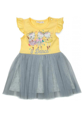Симпатичное трикотажное платье с кошечками-балеринами. Нежное, нарядно - повседневное, двухцветное платье с короткими рукавами-крылышками и мягкой фатиновой юбкой для вашей юной модницы. Платье сшито из мягкого, хлопкового турецкого трикотажа, с добавлением небольшого % эластана для поддержания формы. Трикотаж отличного качества, очень приятный на ощупь. Верх платья нежно-желтого цвета, украшен ярким и эффектным принтом трёх замечательных кошечек-балерин, с добавлением пайеток и глиттерного напыления. Круглая горловина окантована эластичной трикотажной бейкой. Короткие рукавчики красиво присобраны по окату. Юбка платья двухслойная, светло-серого цвета. Нижняя юбка – х/б трикотаж, верхняя – слой мягкого, присобранного фатина, в тон нижней юбке (фатин длиннее нижней юбки). Линия соединения верха платья с юбкой эластична, хорошо тянется и не доставит неудобств при переодевании. Платье отличного качества, замечательно смотрится, отлично носится и, несомненно, понравится вашему ребёнку. Очень милая и симпатичная модель!