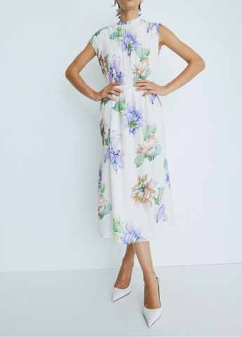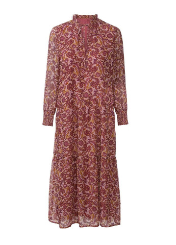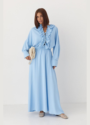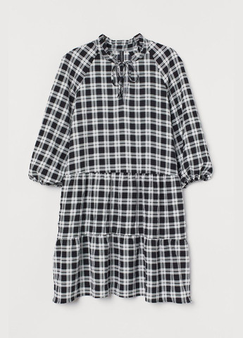 Короткое тканевое платье А-силуэта с небольшим воротником с рюшами, открывающимся сверху и тонким галстуком, длинными свободными рукавами реглан, узкими прорезиненными манжетами и расширяющейся юбкой со сборками. Без подкладки.