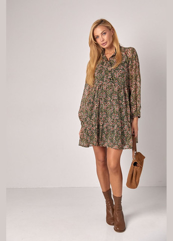 Мелкий цветочный принт и украшение из рюш — неотъемлемые элементы романтического стиля. Платье не просвечивается, поскольку внутри имеет трикотажную комбинацию на тонких бретелях. Отрезная широкая юбка собрана по верхнему краю, а снизу украшена широкой рюшей.