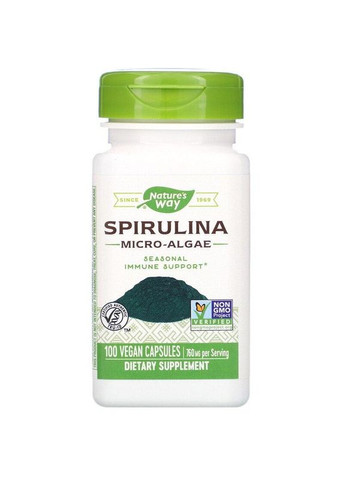 Основные преимущества: Spirulina, Nature's Way, 760 мг, 100 веганских капсул Спирулина известна своей высокой концентрацией витаминов и минералов, что делает ее важным дополнением к ежедневному рациону Порция: 2 капсулы Порций в упаковке: 50 В одной порции % от суточной потребности Белок <1 г 1% Витамин А (бета-каротин из спирулины) 136 мкг 15% Натрий 5 мг <1% Спирулина 760 мг ** * Суточная потребность не определена. ** Процент от суточной потребности основан на диете в 2000 калорий.
