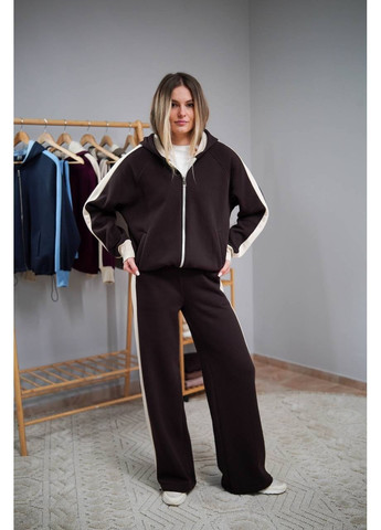 Модель изготовлена ​​из трикотажа тринитка на флисе — плотной, износостойкой ткани, которая отлично сохраняет тепло, при этом дышит и не деформируется после стирки. Благодаря внутреннему слою из мягкого флиса костюм дарит ощущение уюта даже в самые прохладные дни. Особенности модели Утепленный спортивный костюм состоит из двух элементов: Свободно худые на молнии с большим карманом «кенгуру» и капюшоном на шнурках – практично, стильно и комфортно для ежедневного ношения. Брюки фасона джоггеры с комфортной посадкой, поясом на резинке и двумя карманами – для удобства движения и сохранности вещей под рукой. Такой костюм – must-have сезона осень-зима. Он идеально подходит для прогулок, путешествий или активного отдыха, сочетая практичность и трендовый вид. Замеры модели (зависимо от размера): Длина кофты:53,54,54,55 см Длина рукава: 64,67,70,73 см Полуобхват груди: 53,56,59,65 см Длина штанов: 103,103,105,107 см Шаговый шов:74 см Полуобхват талии: 34,38,42,47 см Полуобхват бедер: 48,50,57,60 см
