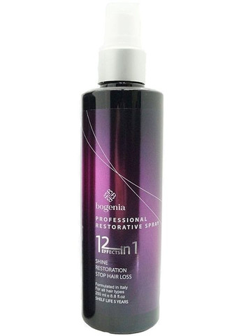 Профессиональный восстановительный спрей для волос 12в1 от бренда Bogenia обеспечивает локонам комплексный уход. Он содержит гидролизованный кератин, который делает пряди крепкими, эластичными и шелковистыми. Масло аргании в составе средства стимулирует восстановление повреждений и придает волосам роскошный блеск, а масло жожоба оказывает кондиционирующее действие и защищает от высоких температур стайлинговых приборов. Особенности Professional Restorative Spray от бренда Bogenia: - глубоко увлажняет и интенсивно питает волосы; - стимулирует восстановление повреждений; - улучшает состояние секущихся кончиков; - устраняет пушистость; - облегчает расчесывание; - обеспечивает эффективную термозащиту; - оказывает смягчающее действие; потере насыщенности цвета крашеных прядей; - надежно защищает волосы от агрессивного воздействия факторов окружающей среды; - длительное действие; - без эффекта отягощения.