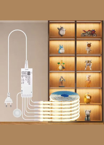 Светодиодная лента сплошного свечения (COB) предназначена для подсветки полок, шкафов, стеллажей, кухонных поверхностей, гардероба, лестниц, зеркал и т.д. Полный набор - сразу готов к использованию. Комплект включает: 6 отрезков ленты по 1м; Контроллер со стандартной евро вилкой 220В; Кнопка для управления; Заводская коробка. Схема подключения изображена на фото. Управление происходит с помощью сенсоной кнопки скрытого монтажа, которая передаёт сигнал нажатия на материал толщиной до 25мм, располагаясь при этом позади. Например, касаясь в определённой области стенки шкафа, сигнал будет проходить через дерево к скрытой позади сенсонной кнопке. Сенсор кнопки распознаёт касания на материалах: дерево, камень, бумага, акрил, пластик, стекло и другие НЕМЕТАЛЛИЧЕСКИЕ материалы. При однократном нажатии происходит включение / выключение. При длительном нажатии происходит увеличение / уменьшения яркости. При выключении лента запоминает яркость. Лента имеет липкую обратную сторону по всей длине. Длина шнура от вилки до контроллера: 1.4м. Длина шнура от контроллера до каждого отрезка ленты: 2м. Длина шнура от контролера до кнопки: 2м. Тип светодиодной ленты: COB (КОБ). Ресурс работы: 30000 часов. Внутреннее напряжение: 12 Вольт. Плотность светодиодов: 320 шт на метр. Количество светодиодных полос: 6 шт. Длина каждой светодиодной полосы: 1 метр. Интервал резки: 2.5 см. Ширина ленты: 8 мм. Цветовая температура: 4000К - 5000К (нейтральный белый). Важная информация: Чувствительность кнопки зависит от толщины преграды (чем тоньше преграда, тем лучше чувствительность). Для избегания помех располагать кнопку следует вдали от металлических материалов.