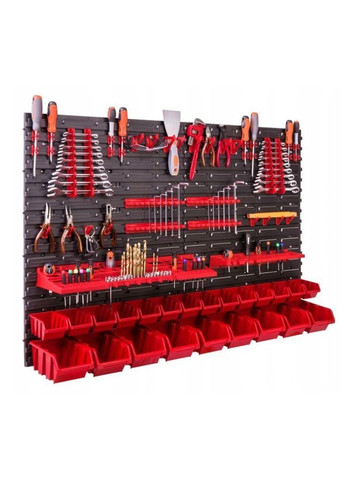 Панель инструментов является эффективным методом организации рабочих мест. Все инструменты собраны в одном месте и будут всегда под рукой. Несмотря на то что пластиковые панели они выдерживают очень большие нагрузки. Стеллаж подходит как для профессионального СТО, автосервиса, так и для подсобного помещения или гаража. Весь набор мобильный, можно составить любую форму или комплектацию под свой инструмент. В комплекте: -14 контейнеров KTR12-3020 красных 115*80*60 мм; – 9 контейнеров KTR20-3020 – 195x120х90 мм Всего 23 контейнера. - 4 панели KBB6040 58,0*39,0 см (или 6 панелей KBS40 39,0x 39,0 см), общая площадь 115,0*78,0 см; - 2 комплекта держателей KBH 20: (8 держателей для рожковых ключей (4 вертикальных 4 горизонтальных); 16 держателей для отверток или другого инструмента). 8 крючков 5,5 см; 8 крючков 3,5 см); - 1 полка для инструмента KBSS40-3020 38,4 x 11,1 x 5,0 см; -1 полка для инструмента KBS60-3020 58,0 x 15,8 x 6,7 см. Вес комплекта –5 кг, габариты в разобранном виде 60*40*20 см. Производство — Польша. Каждый набор можно доукомплектовать нужным количеством панелей, контейнеров, полок, крючков. Прекрасный подарок для людей, работающих или проводящих свободное время в гараже.
