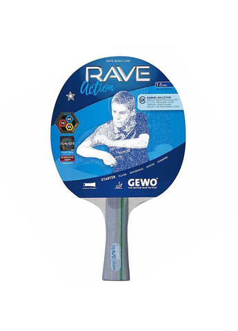 Недорогая ракетка для начинающих с хорошими игровыми характеристиками. Gewo Rave Action - идеальная модель для начинающих игроков и для школьных видов спорта. Благодаря системе Gewo Sensitise Grip чрезвычайно простая в игре и управлении ракетка идеально ложится в руку и обеспечивает стабильный захват. Бренд GEWO успешно вошел в мир настольного тенниса в 1956 году, начав производство теннисных столов. Сейчас компания имеет полный спектр продукции для настольного тенниса и стала одним из крупнейших брендов в Германии. Gewo является спонсором национальных сборных, а также сотрудничает с ведущими игроками, такими как Квадри Аруна, Бенце Майорош, Энцо Англес, Оладжиде Омотайо и другими. Особое внимание GEWO уделяет молодым талантам, инвестируя в их развитие и оказывая поддержку на пути к профессиональному уровню. Рекомендуемый уровень подготовки игрока: начальный уровень (на этом уровне учимся контролировать мяч), средний уровень (предполагает владение базой и основными важными навыками) Стандарты, сертификаты: отсутствуют Стиль игры: Универсальный (AR-) Основа ракетки: 5 слоев, склеенные по особой технологии слои шпона придают универсальной ракетке высокий уровень устойчивости и таким образом хороший контроль над игрой Накладка: губка 1,5 мм, резина GEWO RAVER универсальная резина , жесткость губки: мягкая Скорость: 65/100 Контроль: 95/100 Вращение: 70/100 Форма ручки: Коническая (FL, Flared) Вес: 155 г Особенности: Select Vineer - для основы ракетки используется отобранная вручную комбинация шпона из разных пород дерева для получения заданных характеристик ракетки. Sensitise Grip - ракетка с эргономичным контуром ручки для максимального комфорта и стабильного захвата. Рекомендация от Gewo: для длительного удовольствия от игры на профессиональном уровне с постоянной скоростью и вращением мы рекомендуем чистить ракетку после каждого использования. Обязательно используйте чехлы или футляры для ракетки, когда вы ею не играете. Мы рекомендуем использовать чехол для ракетки Gewo Round Cover, Gewo Graffiti, чехол для 2-х ракеток Gewo Double Cover Spy или алюминиевый кейс Gewo Batcase Alu-Safe.