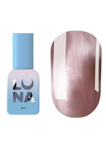 Color Cat Eye – полупрозрачный гель-лак, ложащийся как в один, так и в два тонких слоя. Не ложится полосами при нанесении и легко выравнивается. Имеет среднегустую консистенцию. В составе продукта есть маленькие металлические частицы, которые реагируют на действие магнита, перемещаясь в еще не полимеризованный слой покрытия, обеспечивающий в результате дизайн с волшебным отблеском. Гель-лак Lunamoon имеет стойкое покрытие, не трескается, не скатывается, обеспечивает нанесение с легкостью и удовольствием. Метод нанесения: После выравнивания базой покрываем гель-лак в 1-2 слоя в зависимости от эффекта, который вы хотите получить. Набираем материал на кисточку, прорисовываем центр ногтя, а затем боковые стенки. Кисточкой для тонких линий подводим к кутикуле. Первый слой всегда должен ложиться полупрозрачно. При помощи магнита формируем отблеск. Сушим 60 секунд. Покрываем топом и сушим в лампе 120 секунд.