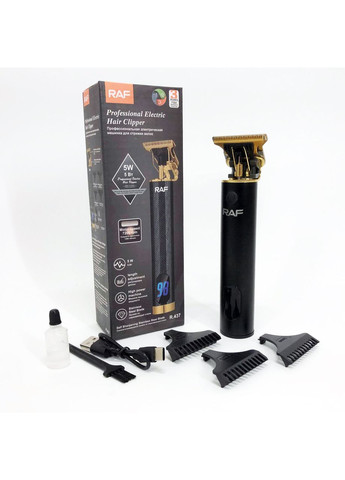 Машинка для стрижки волос и бороды с насадками Raf мужской триммер окантовка с зарядкой от USB Подойдет любому пользователю. Ее невероятно мощный двигатель позволяет быстро стричь волосы и бороды, а прецизионные лезвия можно использовать для создания потрясающих узоров за секунды! Li-Ion-аккумулятор работает до 1-2 часов непрерывно. Литиевая аккумуляторная батарея не теряет емкость, если триммер ставить на зарядку, не дожидаясь полной разрядки, не требует тренировочных циклов «разряд – заряд». Сбалансированный корпус удобно ложится в руку. Работающий со скоростью 7000 оборотов в минуту мотор передает на нож усилие для стрижки волос вне зависимости от структуры или густоты. Комбинация скорости и мощности помогает получить точный окантовочный срез. Имеет стильный дизайн и отлично подойдет как подарок! Характеристики: Питание: Аккумулятор (Li-Ion) Напряжение: 100-240 В/50-60 Гц Время работы от аккумулятора: до 120 мин. Час зарядки: 2 часа. Мотор Роторный Мощность: 5 Вт Количество скоростей: 1, 7000 об/мин Длина стрижки: Т-образный 0,1 мм. Ширина среза: 40 мм Размер: 140 x 40 мм Материал лезвий: нержавеющая сталь Регулировка длины: сменные насадки 0./1.5/2/3/4.5 мм Вес: 154 г. Комплектация: Триммер RAF R.437 Насадки для стержней 1.5/2/3/4.5 мм Кабель для зарядки Щетка для чистки Инструкция