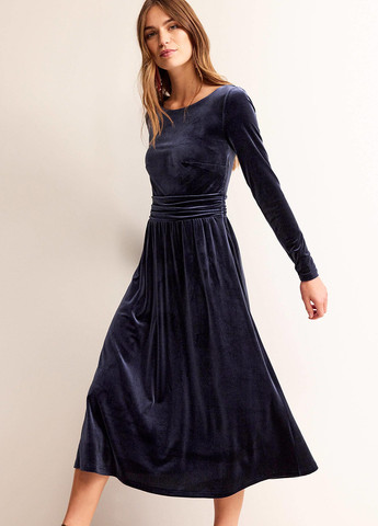 Это изысканное платье выполнено из эластичного плюшевого бархата, что делает его удобным, но стильным предметом для вечеринки. Широкая юбка миди и вырез-лодочка без усилий женственны, и даже есть складки на талии. Можно стирать в стиральной машине. Облегающий фасон и расклешенный крой. Длина до икры. Длинные рукава. Мягкий струящийся трикотаж. Лиф на подкладке. На средний рост (до 172 см).