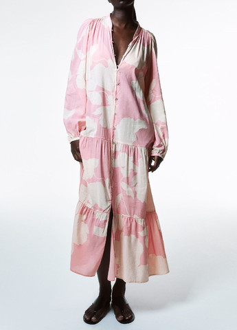 Воздушное платье длиной до икр из смесового Tencel™-лиоцелла. Отложной воротник и застежка спереди, а также кокетка сзади. Слегка заниженная линия плеча и длинные широкие рукава с манжетами на застежке. Крупные нагрудные карманы с прорезями сбоку и накладные карманы спереди. Закрытая резинка на талии и слегка расклешенная юбка. Без подкладки.
