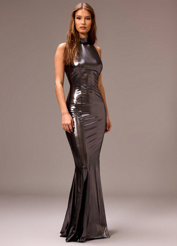 Вечернее платье темно-серого цвета металлик. Платье без рукавов с воротником-стойкой и естественной линией талии. Оно имеет приталенный крой и низ «русалка». Платье имеет молнию сзади и легкую стрейч.