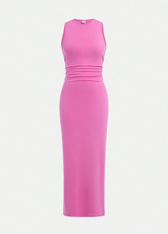 Розовое платье без рукавов с круглым вырезом и высокой талией. Одежда изготовлена из слегка эластичной ткани. Модель имеет приталенный крой и закругленный край.