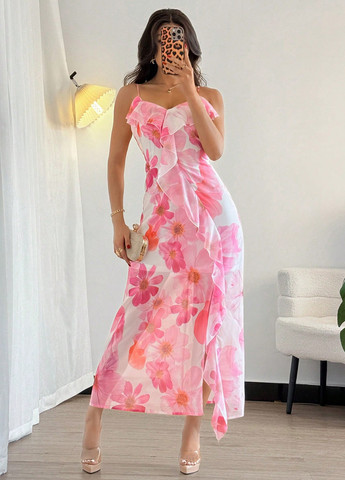 Платье украшено ярким цветочным принтом в оттенках красного, розового, голубого и белого – настоящий взрыв цветов!