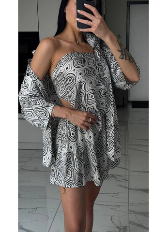 Топ-хлестинка — нежный и одновременно выразительный. Его открытый крой подчеркивает линию плеч, декольте и ключицы. Выполненный из той же ткани софт, но украшенный выразительным геометрическим принтом, контрастирующим с однотонной базой костюма. Принт добавляет акцент, выделяя топ как главную деталь образа, привлекает внимание, но не перегружает.