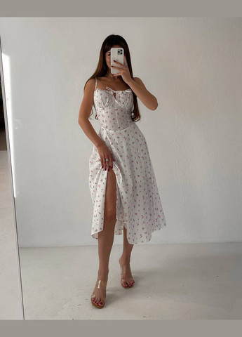 Платье имеет изящные бретельки-завязки, которые не только придают нежности, но и позволяют регулировать посадку. Изюминка модели – имитация корсета в верхней части, визуально подчеркивающая линию талии, придающая силуэту четкости и намеку на винтажную элегантность. Такая деталь придает образу структуры, оставаясь мягкой и комфортной в носке.