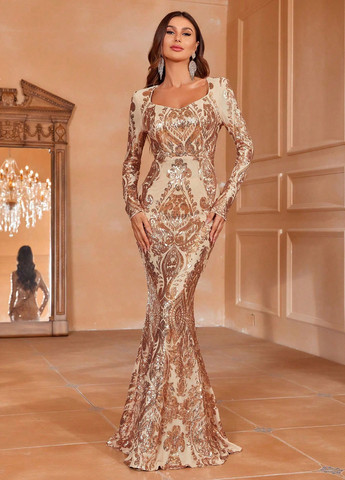 Элегантное платье-русалка с пайетками Это выпускное платье имеет вырез в форме сердца и высокую талию. Платье сшито из ткани средней эластичности и имеет облегающий крой. Оно застегивается на молнию и имеет обычный фасон рукава. Подол имеет форму русалки.