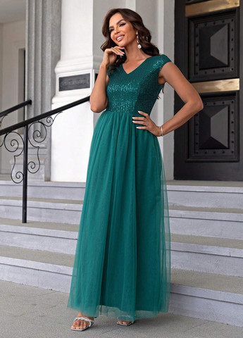 Модель выполнена из нежного шифона (100% полиэстер) и щедро украшена пайетками, которые переливаются при каждом движении. Расклёшенный силуэт в сочетании с глубоким V-образным вырезом создаёт гармоничный баланс между женственностью и элегантностью. Боковая молния обеспечивает удобную посадку.