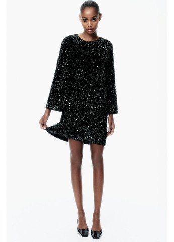 Изысканные паетки декорируют платье, придавая игру света и придавая вам великолепный, блестящий вид, а экокожа дополняет дизайн, создавая контраст и придавая платью долю дерзости и стиля.