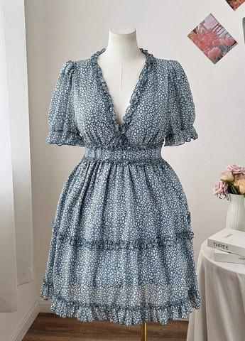 Короткое тканевое платье А-силуэта с небольшим воротником с рюшами, открывающимся сверху и тонким галстуком, длинными свободными рукавами реглан, узкими прорезиненными манжетами и расширяющейся юбкой со сборками. Без подкладки.