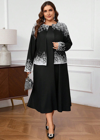 Комплект из жакета больших размеров и платья без рукавов Clasi представляет собой ансамбль, состоящий из двух частей. Одежда выполнена в черной цветовой гамме. В дизайне использован простой принт. Ткань слегка тянется.