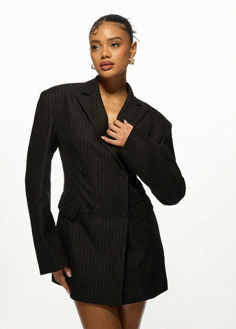 Это платье сочетает в себе деловой стиль и элегантность. Оно имеет дизайн жакета в тонкую полоску и длину мини. Свободный крой и естественная средняя талия обеспечивают комфорт. Детали включают двойные пуговицы, карманы и застежку на пуговицы спереди. Оно имеет обычные рукава и расклешенный подол. Ткань слегка тянется для удобства движения.